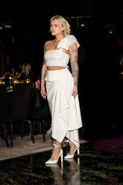 This all-white ensemble is a modern take on asymmetry and texture, blending structure with fluidity.